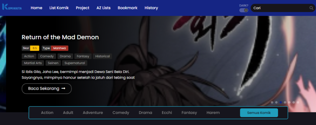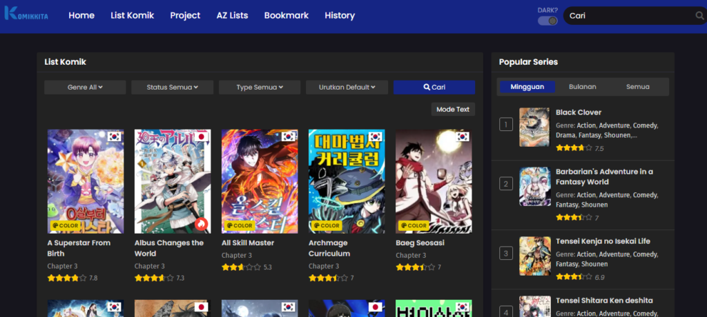 - List Komik – Menampilkan ikon genre, status (ongoing-komplit-hiatus), tipe komik (Manga, Manhwa, Manhua, komik & novel), lalu urutan default.