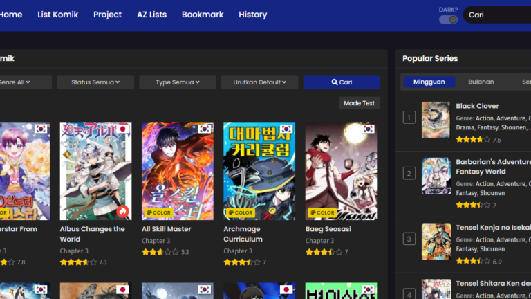- List Komik – Menampilkan ikon genre, status (ongoing-komplit-hiatus), tipe komik (Manga, Manhwa, Manhua, komik & novel), lalu urutan default.