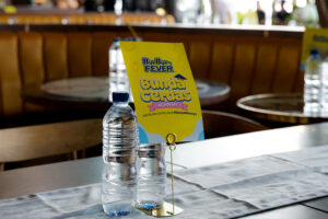 Karena seluruh meja dibagian tengah sudah penuh, mau ngga mau saya duduk di pinggir, yang mana sebagian besar stage ketutup partisi antara meja satu dan lainnya. Gapapa yang penting masih bisa dengar seseruannya.
