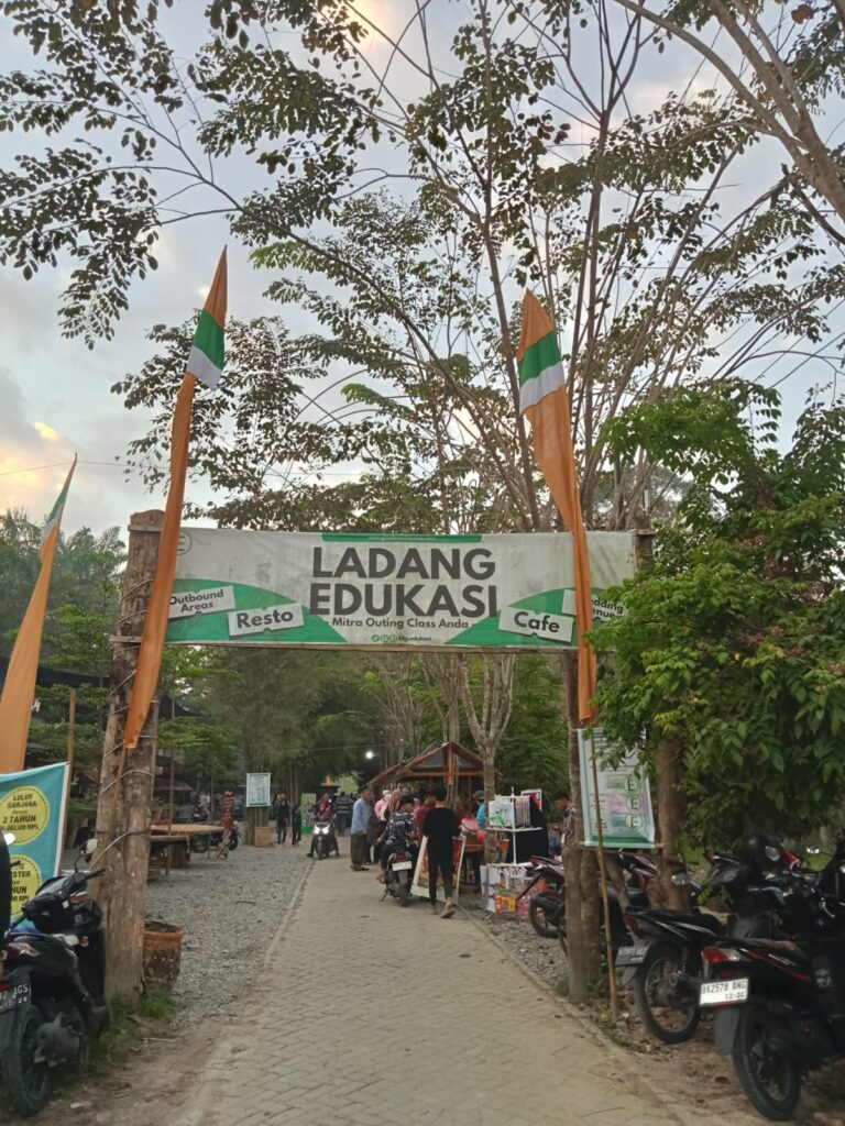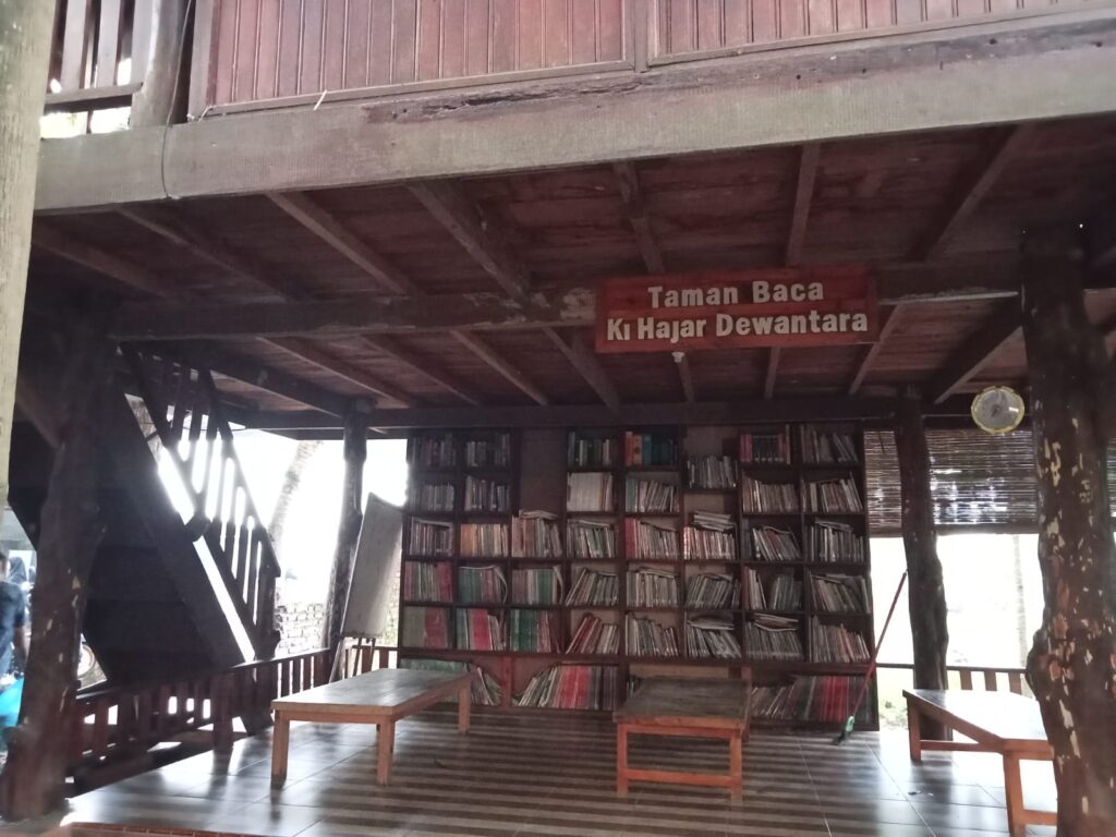Sembari menunggu yang lain makan, saya mencoba keliling area ini. Hasilnya saya menemukan semacam pendopo kayu bertingkat ada beberapa biji, dimana bagian bawah dibiarkan terbuka dan ada rak lengkap berisi buku-buku bacaan. Terdapat papan bertuliskan “Taman Baca” di atap bagian depan. Saya ngga mendapatkan informasi apa-apa soal tempat ini karena yang mau dijadikan nara sumber juga ngga ada. Tapi kalau mau tebak-tebak buah jambu, tempat ini mungkin sehari-hari adalah sebagai sarana belajar yang diberi nama Ladang Edukasi. Baik itu untuk membaca, berkarya dan berkreasi bagi para penggiat literasi dan seni.